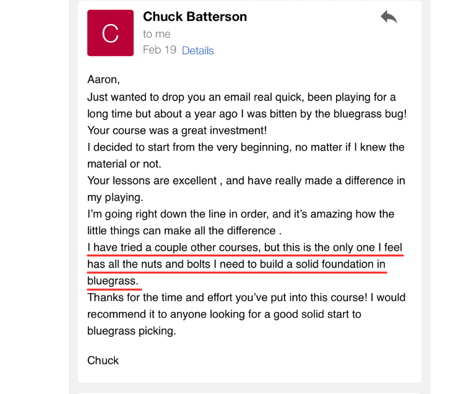 “If your a guitarist who is looking for a bluegrass flatpicking guitar course that gets right down to the "meat and potatoes" then this course is for you. It's all hands on training with great videos, tablature, and words of encouragement from Aaron every step of the way. If you apply yourself you'll see definate improvement in your guitar playing skills that you'll be very pleased with and will serve you well for many years to come”
